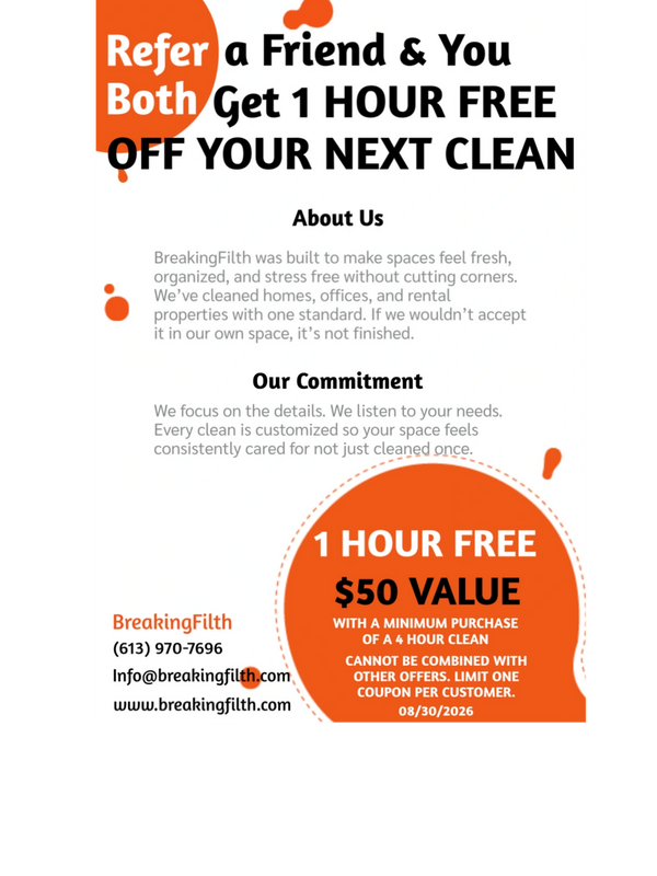 When They Book a Minimum 4-Hour Cleaning, They’ll Receive 1 FREE Hour Added to Their Service (5 Hours Total). As Our Thank You, You’ll Receive 1 FREE Hour added to Your Next Purchased 4-Hours Clean (5 Hours Total).